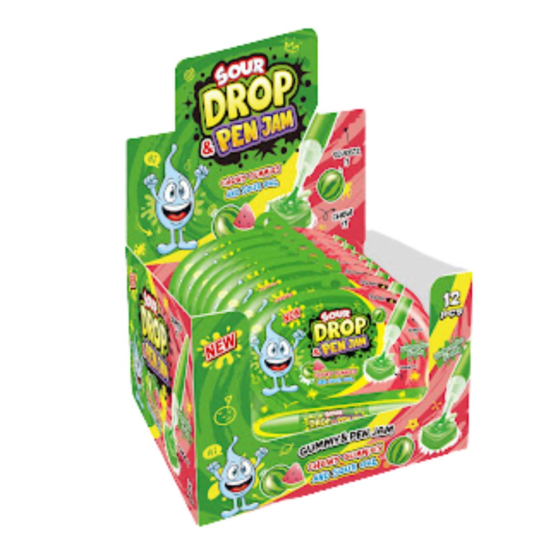 Sour Drop Pen Jam arbūzų skonio guminukai – tai rūgštūs guminiai saldainiai su skystu arbūzų skonio užpildu. Minkšta guminukų tekstūra ir gaivus vaisinis skonis sukuria malonų saldumo ir rūgštumo derinį.