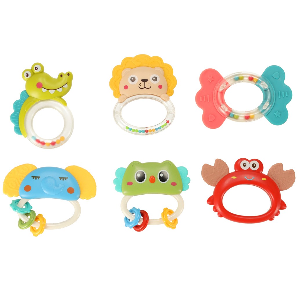 Kūdikių barškučių ir kramtukų rinkinys „Gyvūnėliai“, 6 el. – tai puikus sensorinių žaislų komplektas mažyliams nuo pirmųjų gyvenimo mėnesių. Rinkinyje esantys barškučiai ir kramtukai yra įvairių gyvūnėlių formų, skirtingų tekstūrų ir spalvų, todėl padeda lavinti kūdikio klausą, regą, lytėjimą ir motoriką.