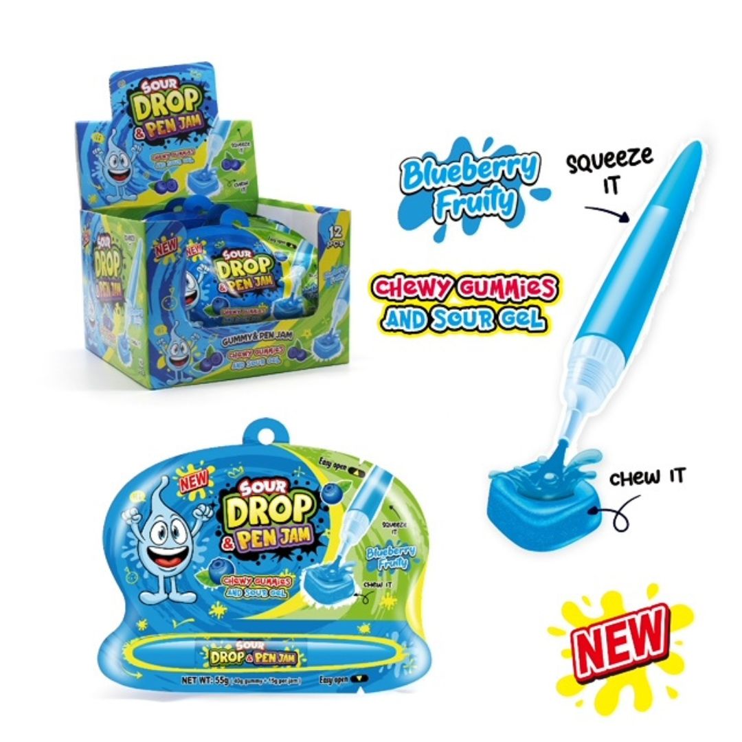 Sour Drop Pen Jam mėlynių skonio guminukai – tai rūgštūs guminiai saldainiai su skystu mėlynių skonio užpildu. Minkšta guminukų tekstūra ir intensyvus vaisinis skonis sukuria malonų saldumo ir rūgštumo derinį.