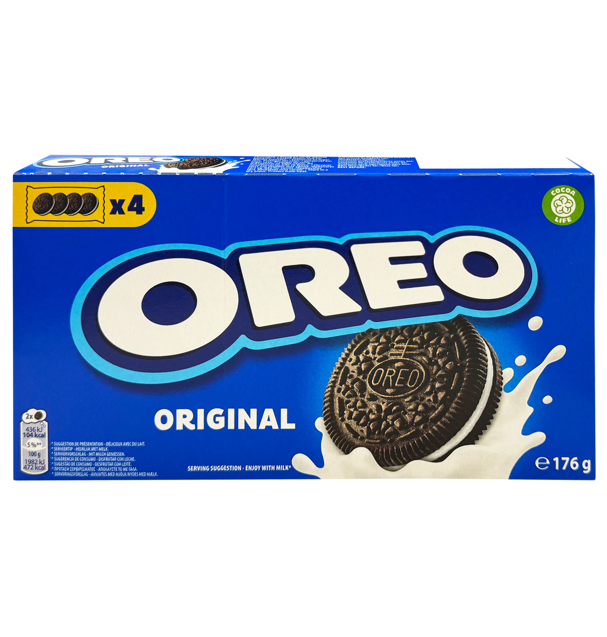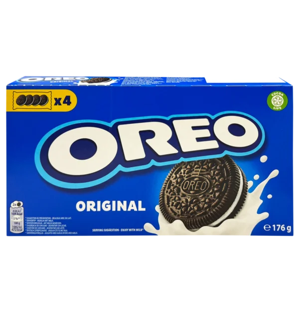 OREO – vieni populiariausių sausainių pasaulyje, mėgstami tiek vaikų, tiek suaugusių. Tai traškūs šokoladiniai sausainiai su švelniu vaniliniu kremu viduje. 176 g pakuotė patogi tiek dalijimuisi, tiek mėgavimuisi vienam. Puikus pasirinkimas saldumynų mėgėjams arba greitam, paprastam užkandžiui.